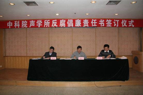 为深入贯彻落实党的十七大精神和党中央国务院《关于实行党风廉政建设责任制的规定》,根据院党组的要求和北京分院的部署,12月17日,声学所举行党风廉政建设责任书签订仪式,王小民所长和张春华书记与其他所领导、所长助理、中层以上党政领导干部共同签订责任书。签订仪式由纪委副书记苏媛同志主持。