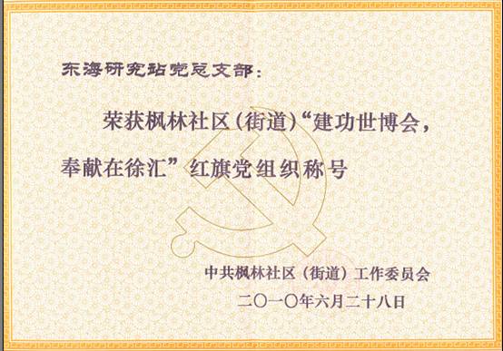 东海站党总支贯彻落实上海市委的要求精神,组织全体党员积极参与徐汇区枫林社区党工委组织的“建功世博会,奉献在徐汇”的组织活动。以世博会为平台,以社区为舞台,宣传世博会,服务世博会,倡导志愿者服务,同时严格落实各项措施,确保平安世博。日前东海研究站党总支被评为枫林社区红旗党组织,并在徐汇枫林社区党工委召开的迎接建党89周年的大会上获得表彰。同时,王浩亮、王欢同志被评为枫林社区优秀共产党员。