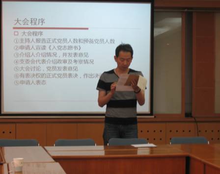 党支部书记周旭主持会议,首先宣布本支部共有正式党员16人,到会13人,3人因在外地出差缺席。