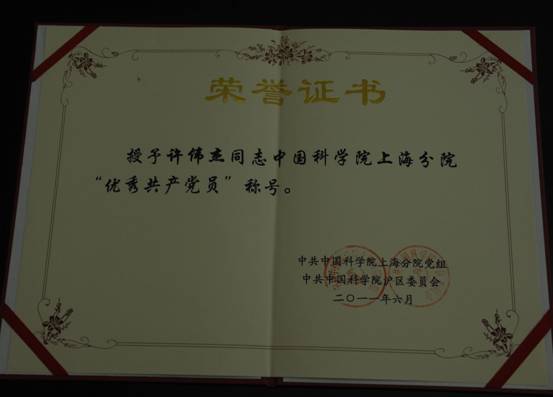 大会表彰了一批先进党组织、优秀共产党员和优秀党务工作者。我站许伟杰同志被授予“中科院上海分院优秀共产党员”称号。作为一名科技工作者,许伟杰同志锐意进取、求真务实、开拓创新为东海站科研事业做了许多卓有成效的工作,展现了科技战线共产党人的优良品格。