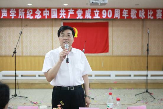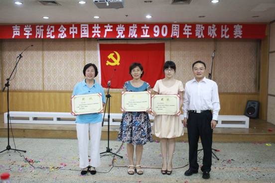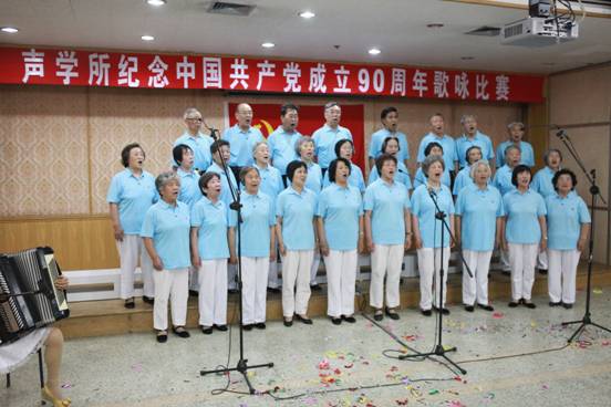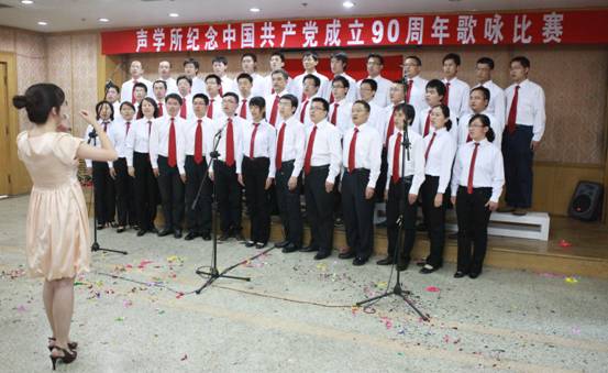 2011年6月27日下午,声学所党委在DSP大楼多功能厅隆重举行了“纪念中国共产党成立90周年”歌咏比赛,共有19个支部组成的参赛队、近500余名职工、研究生参加并观看了比赛。广大党员群众用嘹亮歌声唱响红色经典,赞颂党的恩情,抒发新时代壮志豪情。王小民所长,张春华书记,居琦副所长,倪宏副书记、副所长,李风华副所长等所领导以及所党委委员孙长瑜、李双田、王秀明、李淑秋、郭良浩同志都来到现场,担任评委并参加了演出。张仁和院士、汪承灏院士也加入了各自参赛队的演出。整个多功能厅充满了喜庆、祥和的气氛。