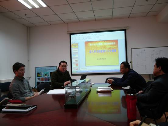 支部书记田杰同志详细介绍了十八大精神要点,列举各次党的全国代表大会举办的历史背景,将十八大与历届大会的内容作了详细的对比,总结了国家的变化和党的进步。同时也陈述了十八大对党章内容的修改,强调十八大代表们一致同意在党章中把科学发展观同马克思列宁主义、毛泽东思想、邓小平理论、“三个代表”重要思想确立为党的行动指南,将科学发展观理论地位作以详尽阐述,并指出将科学发展观作为必须长期坚持的指导思想的重要意义。他强调要在思想认识上高度重视十八大会议的学习工作,精心准备,认真学习,避免将十八大精神的学习流于形式。而后他对实验室今后深入学习贯彻党的十八大精神工作做出了具体安排。
