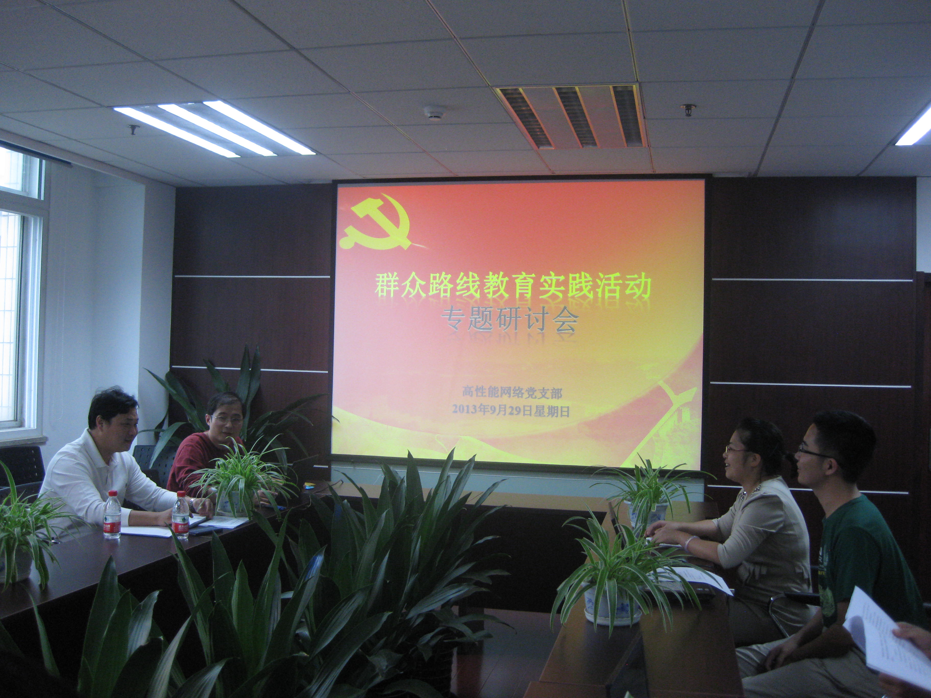 2013年9月29日下午2点,高性能网络党支部在DSP 5层会议室,就党的群众路线教育实践活动认真开展专题学习研讨会,本支部共有22名正式党员和4名积极分子,全部参加。办公室程洋主任参加了会议。