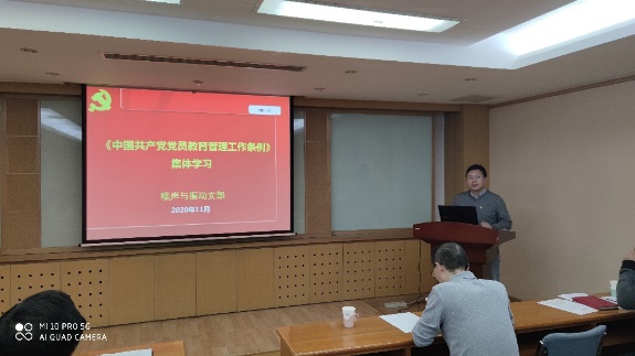 党支部副书记管鲁阳带领大家集体学习《中国共产党党员教育管理工作条例》有关内容。白国锋给全体党员做了一次党课,集体学习了党的十九届五中全会精神。