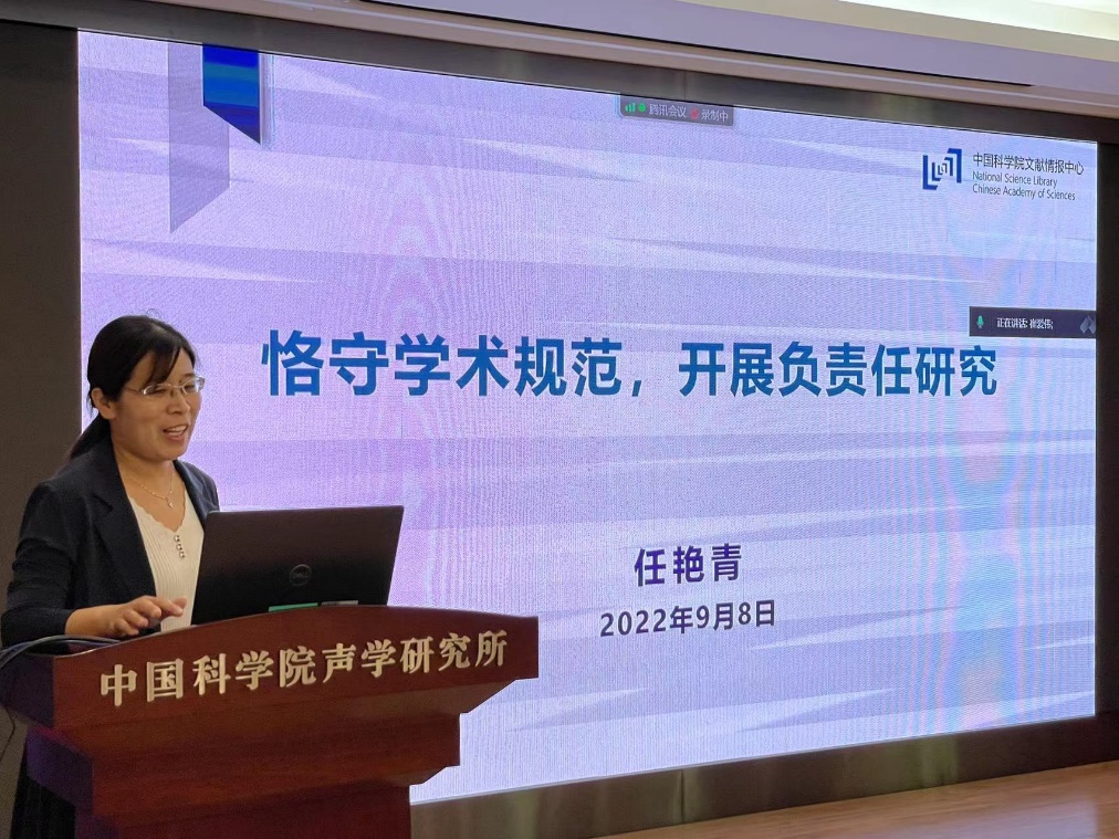 为了进一步加强科研诚信建设,2022年9月8日,声学所邀请中国科学院大学“学术道德与学术写作规范”授课教师、中国科学院文献情报中心任艳青博士为全所科研人员、研究生导师、学生等授课。本次培训由所人力资源部承办、所监督审计(纪委)办公室协办,以视频会议形式开展,共有692人在线参加学习。