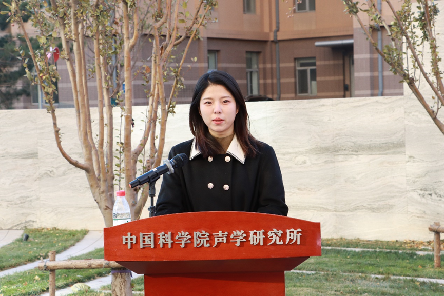 青年学生代表曹子祎发言,她表示将以声学所老一辈科学家为榜样,不断求知、探索、创新,高扬理想风帆,铭记报国之志,放飞青春梦想,谱写壮美新篇章。
