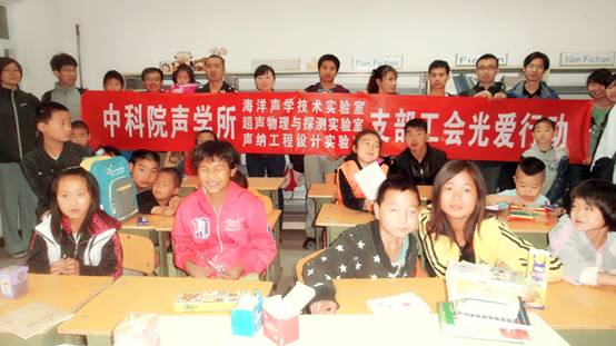 2014年5月11日,海洋声学支部、超声支部和声纳工程支部及分工会联合组织了“光爱行动”。参加此次活动的职工和学生冒着中雨,坚持参加活动,为北京市顺义区光爱学校70余名孤残儿童送去了爱心。本次活动采取实验室职工、学生自愿捐款和支部及工会赞助相结合的募资方式共筹措善款4700元,为光爱学校的孩子们送去了大米、面粉、食用油、硒鼓等生活用品和办公用品,同时还为他们奉上了一堂生动有趣的声学科普小实验,让孩子开拓了视野,增长了知识。