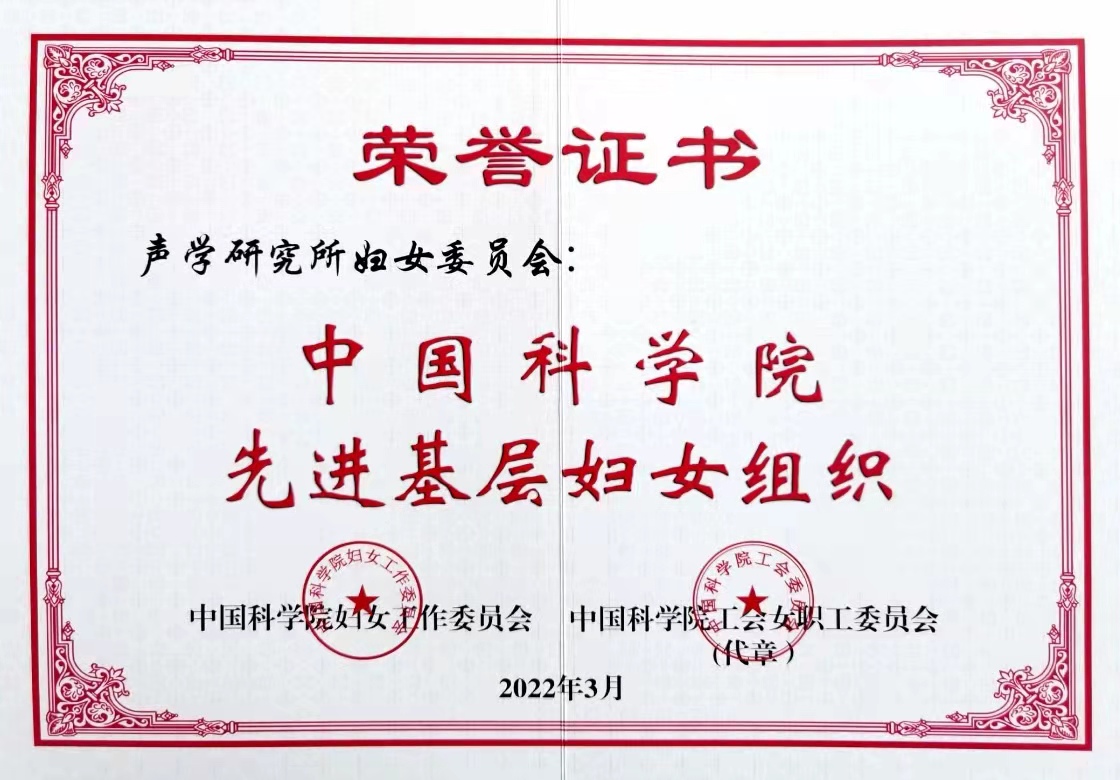2022年3月7日,中国科学院妇女工作委员会、工会女工委员会召开心系“国家事”肩抗“国家责”先进事迹报告会暨表彰大会,声学所妇委会获中科院“先进基层妇女组织”荣誉称号。