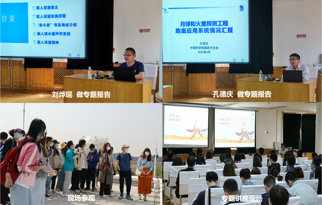 2022年4月23日,声学所、空天院、国家天文台团委联合在中国遥感卫星地面站--密云站开展“空天海地话创新担当奋斗正青春”纪念“五四”运动主题教育活动。“奋斗者”号载人潜水器副总设计师、声学所高级工程师刘烨瑶,首次火星探测任务地面应用系统副总设计师、国家天文台研究员孔德庆,密云站朱达伟、崔师爱老师受邀做专题报告,近100名青年职工和学生代表参加了此次活动。