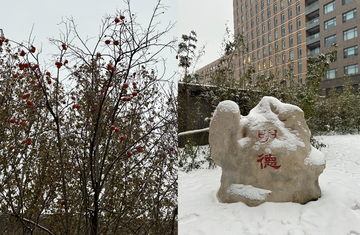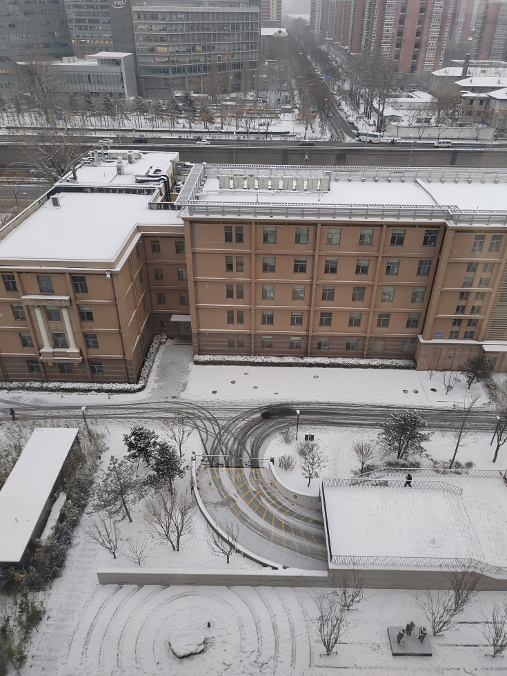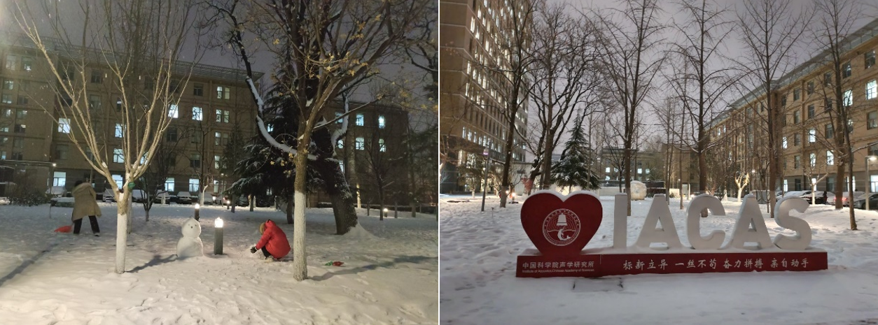 冬天的早晨,我们像往常一样走进声学所园区。然而,今天的园区与以往有些不同,雪花在空中飘洒,宛如翩翩起舞的蝴蝶,地上铺满了厚厚的积雪,仿佛是天地间的一张白色绒毯。