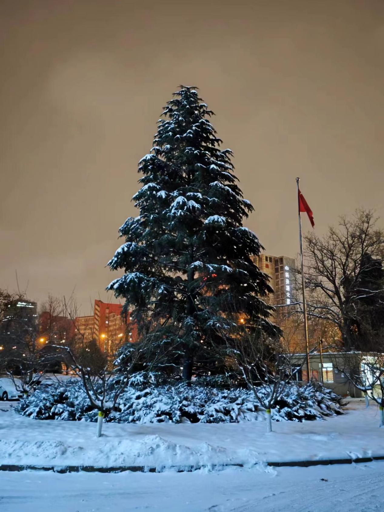 声学所的建筑轮廓在雪的映衬下变得分外清晰,白雪覆盖的屋顶仿佛是披上了一层银装,散发着淡淡的光泽。灯光透过窗户洒在雪地上,映照出模糊的光影。院子里的树木被雪压弯了腰,仿佛在为这片寂静的夜晚低头致意。