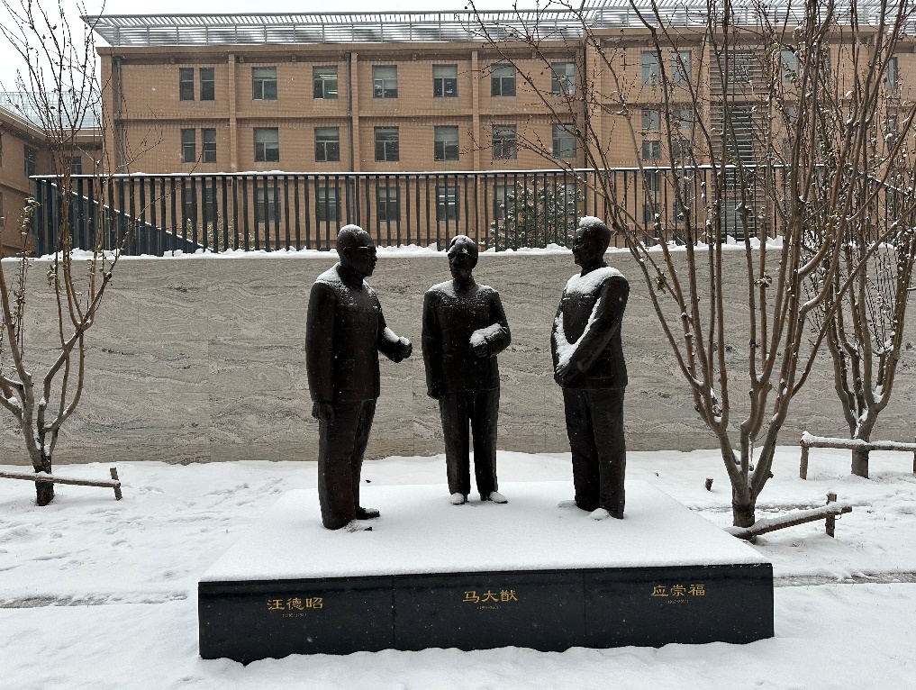 从办公室的窗户望下去,正好能看到科研综合楼南广场上“三驾马车”的雕塑,雪花飘飞中,三位老科学家相谈甚欢。他们虽然已经离开了,但他们奋斗过的足迹却写在祖国声学发展的史册上,如熊熊火炬引领我们继续前行。地下车库的出口一道道车辙画出相似却不同的曲线,循迹前进,却又有新的变化,新的突破,正所谓“人生到处知何似,应似飞鸿踏雪泥。”