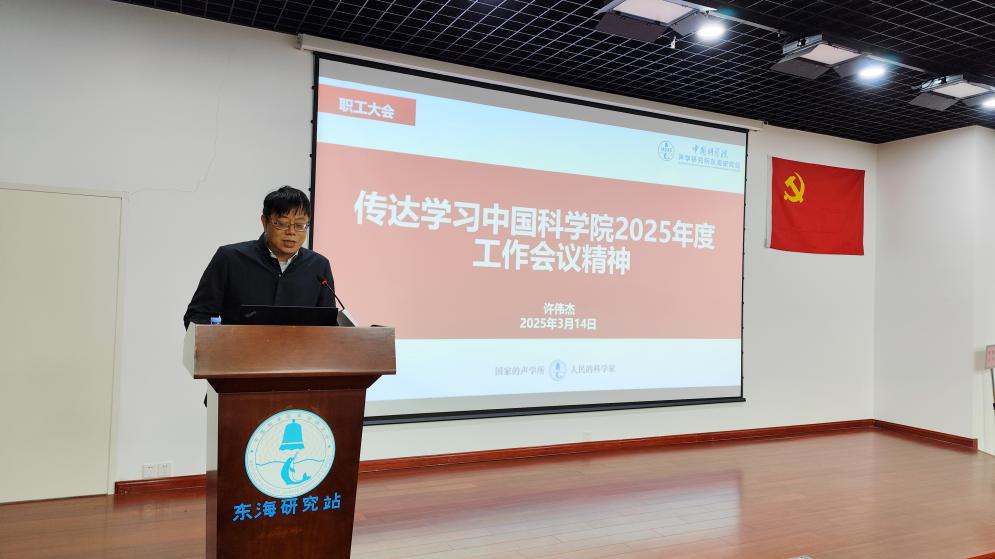 党委书记、站长许伟杰首先传达了中国科学院及声学研究所2025年度工作会议精神并作东海站2024年度工作报告。2024年,东海站以习近平新时代中国特色社会主义思想为指导,深入学习贯彻党的二十大和二十届二中、三中全会精神,持续推进党纪学习教育常态化长效化,紧紧围绕抢占科技制高点核心任务和“登攀2024”工作主题,以钉钉子精神奋力推动研究站改革创新发展走深走实,在重大项目争取、党建与科研深度融合、人才引留培体系建设、创新文化生态构建等方面取得新成效,研究站各项事业稳步发展。他强调,全站职工要以高度的使命感责任感紧迫感,聚精会神抓攻坚,雷厉风行抓改革,锲而不舍抓落实,统筹推进2025年度各项工作落实落细,确保高质量完成“十四五”目标任务,系统谋划“十五五”创新发展,全力以赴抢占科技制高点,为加快实现高水平科技自立自强和建设科技强国作出更大贡献。