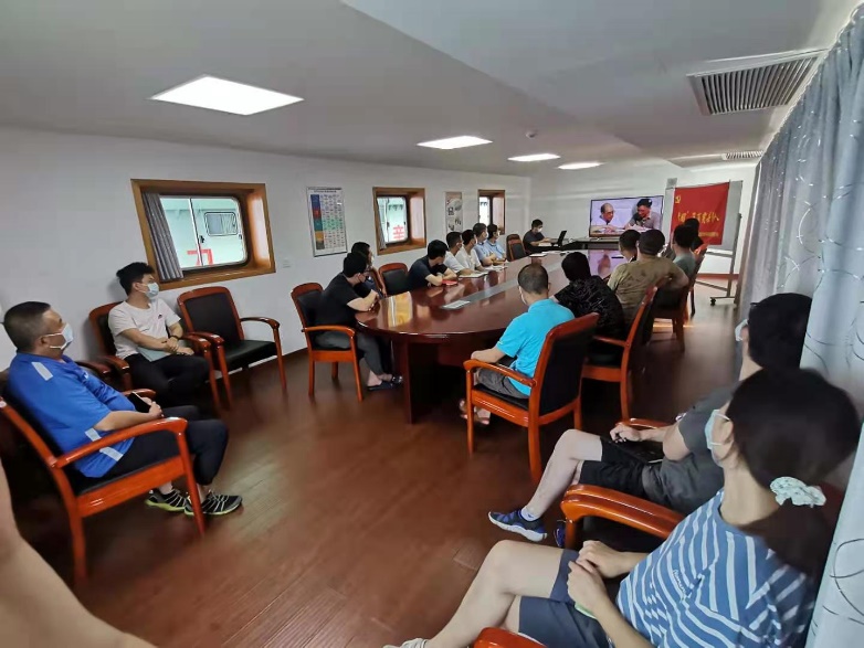 2021年8月18日上午,声学所“德昭”深蓝突击队在杭州千岛湖新安江实验场“实验叁号”船三楼会议室集中学习。会议由水下航行器党总支书记刘明刚主持,突击队队长郝程鹏研究员带领现场参加湖试的突击队成员参加了会议。