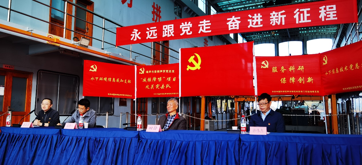 2022年10月31日上午,中科院声学所噪声与音频声学党总支联合新安江实验场党支部、水下信息技术党总支和水下环境信息感知党支部在新安江实验场实验船上开展了“永远跟党走,奋进新征程”党支部联学联建活动,二十大列席代表田静从二十大会议总体情况、会议主要精神以及个人体会三个方面为大家传达讲解了二十大会议精神,正在湖上开展实验工作的三十多位党员及积极分子参加了学习活动。东海站站长、新安江实验场主任许伟杰,噪声与音频声学实验室主任、“减振降噪”项目攻关突击队队长程晓斌,水下信息技术实验室副主任王朋,水下环境信息感知实验室副主任贾宁,新安江实验场老支部书记刘月明和新安江实验场副主任、支部书记金榜等同志结合自身工作,分享了学习二十大精神的心得体会。