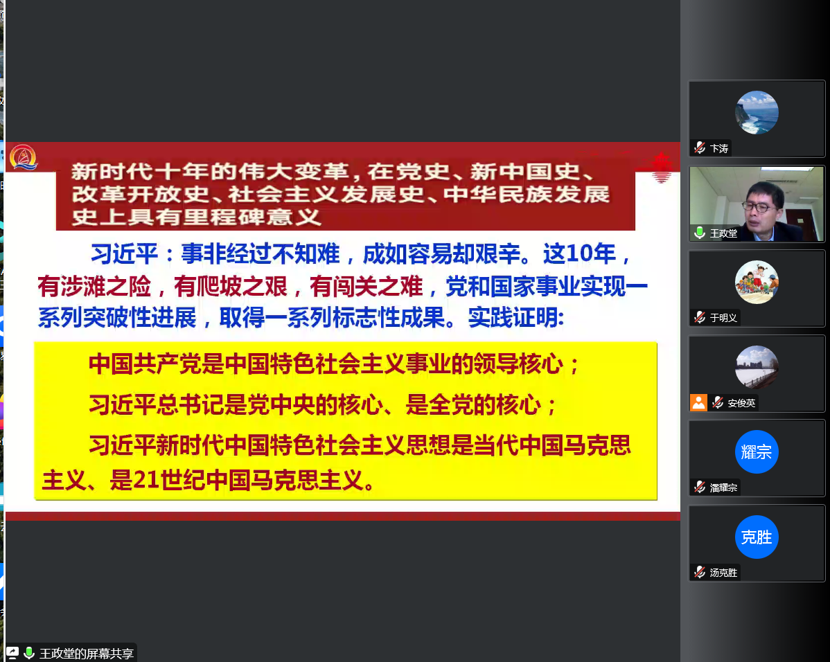 为深入学习宣传贯彻党的二十大精神,把全站广大党员干部职工的思想和行动统一到党的二十大精神上来,迅速掀起学习宣传贯彻党的二十大精神的热潮,12月13日上午,中科院声学所北海研究站召开学习贯彻党的二十大精神专题报告会,邀请青岛市委党校党史党建部副主任王政堂教授宣讲党的二十大精神,站领导及在职职工共四十余人参加会议。因疫情防控需要,报告会采用线上形式开展。