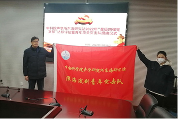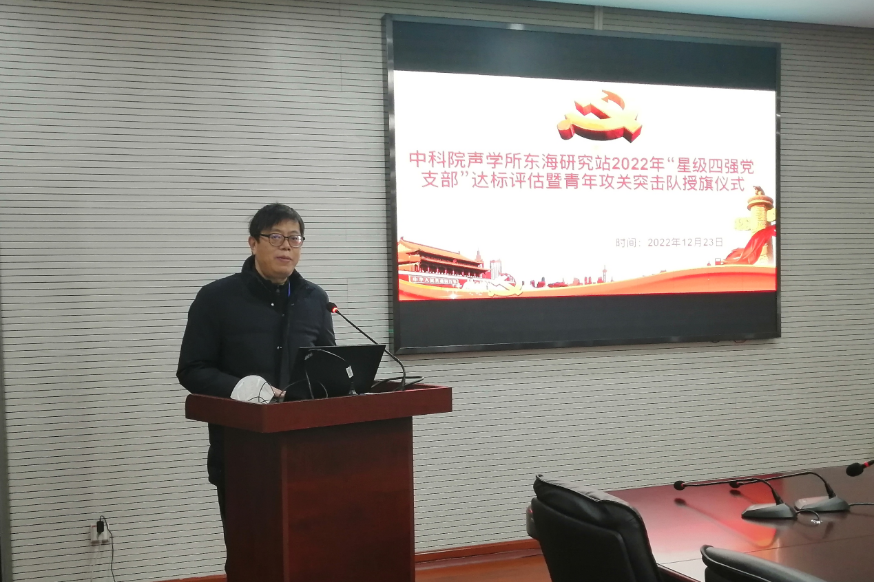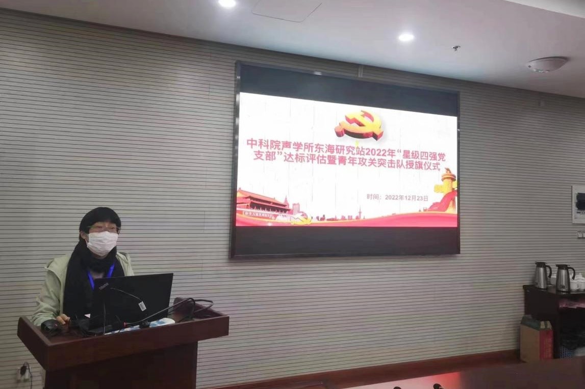 2022年12月23日,中国科学院声学研究所东海研究站党委召开青年攻关突击队授旗仪式暨2022年“星级四强党支部”达标评估会。东海站党政领导班子成员、党支部书记、委员等通过线上线下相结合的形式出席会议。上海分院党建督导组成员方婷、吴燕华、何静参加了会议。会议由党委副书记、副站长刘晓隽主持。