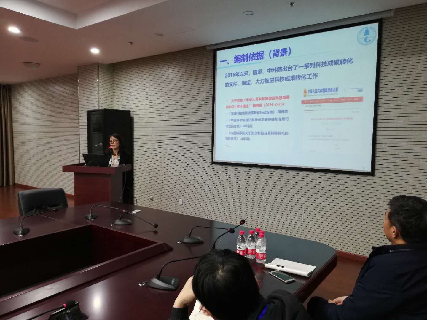 为贯彻落实国家创新驱动发展战略和中国科学院“十三五”发展规划纲要,促进东海站科技成果转化工作提质增效,3月21日,东海站组织召开了2019年度科技成果转化工作培训会。院创业投资管理有限公司投资总监秦明艳博士、所科技发展部主管金赛敏应邀作培训报告。东海站主管部门负责同志、各研究室负责人及相关科研人员共计30余名人员参会,科研科科长诸向阳主持。
