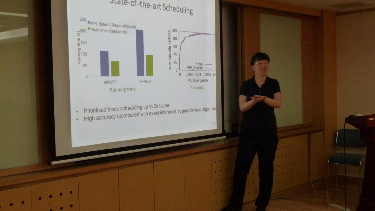 报告中,高教授介绍了目前大数据问题下的分布式计算研究进展。报告主要分为两个部分,前半部分高教授主要介绍了在大数据问题下,置信传播算法的分布式计算模型。该模型通过优化置信传播算法中迭代更新步骤,使得分布式置信传播算法更加高效快捷;报告的后半部分,高教授主要介绍了推荐系统中矩阵补全问题的分布式计算模型。该模型通过矩阵分解等方法,改进了矩阵补全问题的分布式效率,得到较好的分布式性能。