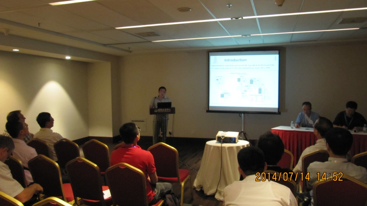 徐德龙副研究员做了两个报告,分别汇报了利用超声波降低超重油水包油降粘体系的粘度(Research on viscosity reduction of oil in water for ultra heavy crude oil by using of ultrasonic wave)的研究成果和双源声反应器中空化空间分布的优化控制(Optimization control of cavitation spatial distribution in a dual source sonoreactor)的研究成果。