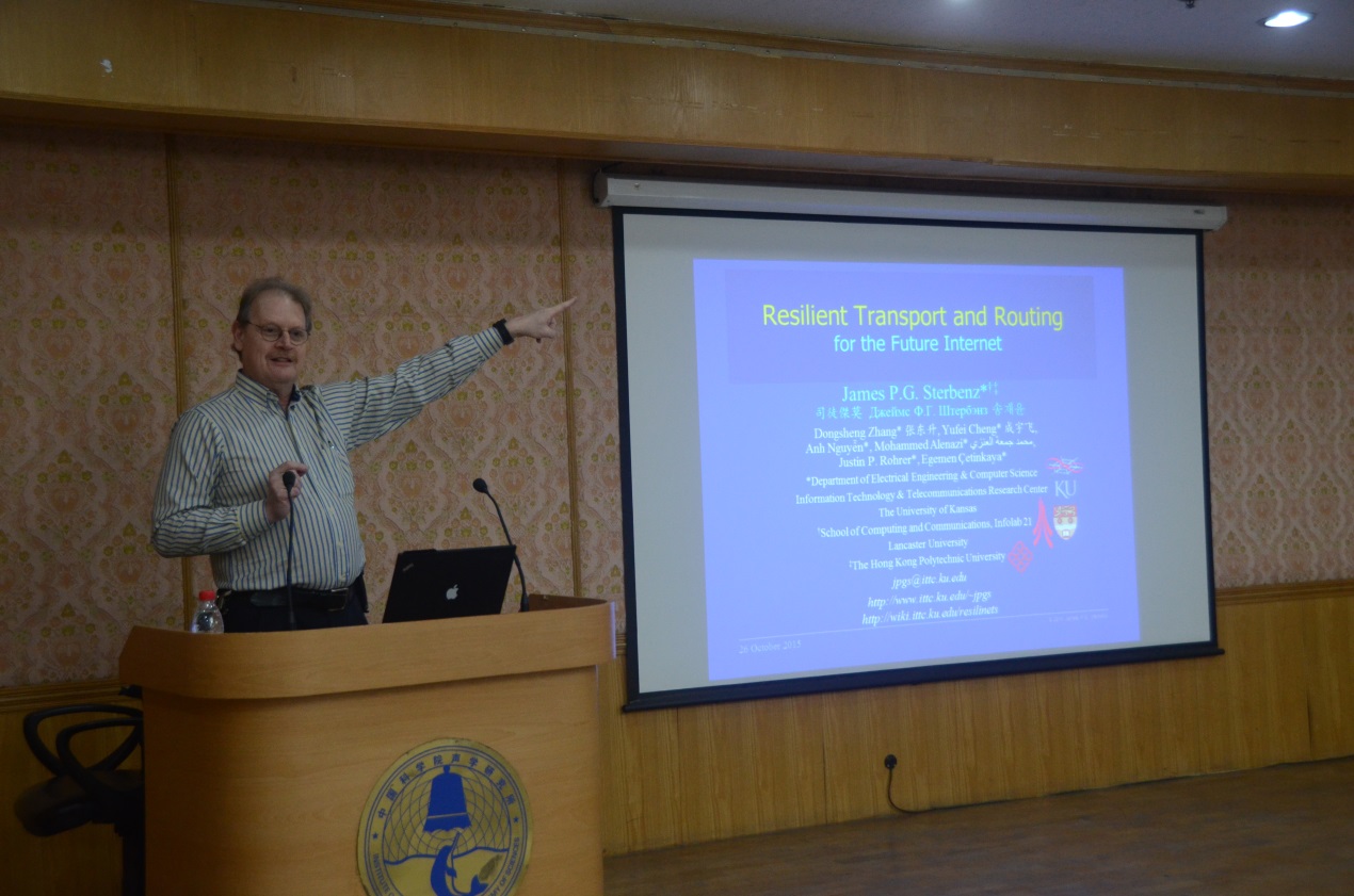应国家网络新媒体工程技术研究中心的邀请,美国堪萨斯大学的James P.G. Sterbenz教授于2015年10月26日来到中国科学院声学研究所进行学术交流,并进行了题为“Multilevel Resilient Topology, Transport, and Routing for the Future Internet”的学术报告。报告在DSP四楼多功能厅举行,新媒体中心主任王劲林研究员、副主任邓浩江研究员和众多师生参加了此次报告。