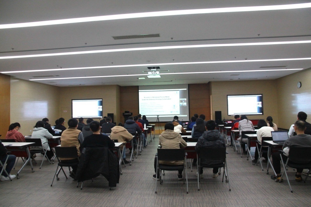 会议分为特邀专家报告和青年科研人员报告两部分。王秀明研究员作了题为《多相孔隙介质声学研究》的报告,介绍了从能量守恒的角度,在多相孔隙介质中声波满足的几种动力学方程表达式的理论推导工作以及多相空隙介质中声波的传播模型及应用实例,强调了深地声学探测的重要性。报告后,与会人员就地球物理中的第一性原理概念以及相关设备在使用中遇到的具体多相孔隙介质声传播问题等与专家展开热烈的讨论。