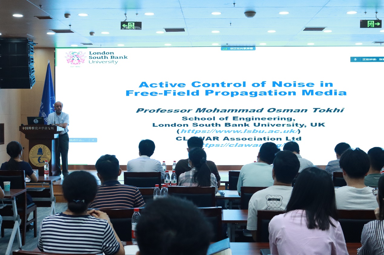 随后,M. O. Tokhi教授做题为Active Control of Noise in Free-field Propagation Media学术报告,介绍了基于波形干扰的噪声抵消基本概念,讨论系统的几何形状对设计和系统性能的影响,同时介绍了控制系统设计公式推导过程及其在自适应控制情况下的扩展,并在选定的试验环境中演示了系统性能。