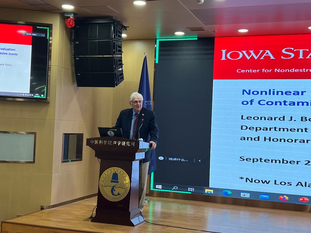 2023年9月22日下午,中国科学院声学研究所2023年第15期学术交流会在所内成功召开。本期学术交流会由科技发展部和超声学实验室共同组织,邀请爱荷华州立大学Leonard Bond教授、恩塞纳达科学研究与高等教育中心Tobias Mueller研究员作学术报告。声学所首席科学家王秀明研究员、超声学实验室主任陈德华研究员、以及声学所广大职工和学生参加了交流,超声学实验室副主任何晓主持会议。