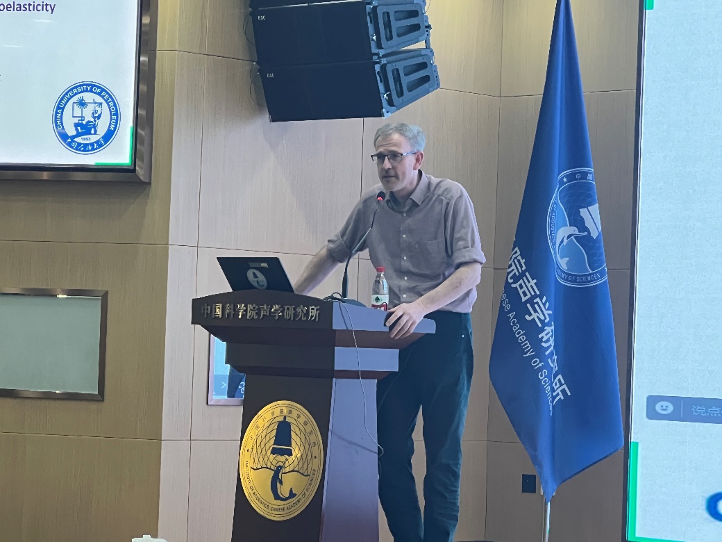 Tobias Mueller博士作Fundamentals of Poroelasticity报告。他针对现有弹性势能表达式无法分析孔隙度及其变化这一问题,提出并深入阐述了一种基于体积平均法的广义孔隙弹性表达方法,探讨了流固间的非互易相互作用等关键概念,并总结展望了这些理论在描述复杂孔隙介质波传播特征时的潜在应用。