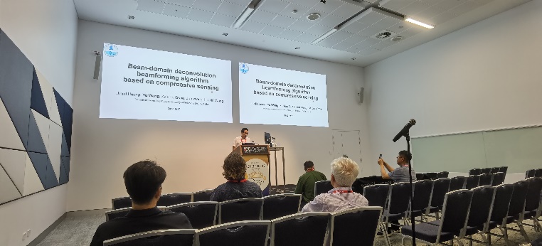王域博士和聂磊鑫参与了信号处理专题的分会交流,王域博士做了题为Beam-domain deconvolution beamforming algorithm based on compressive sensing的学术报告,讨论了一种基于压缩感知的适用于任意阵型的解卷积波束形成技术。聂磊鑫的报告题为Classification of underwater soundscapes using raw hydroacoustic signals,介绍了一种使用原始声压信号进行海洋声景分类的新型神经网络模型。