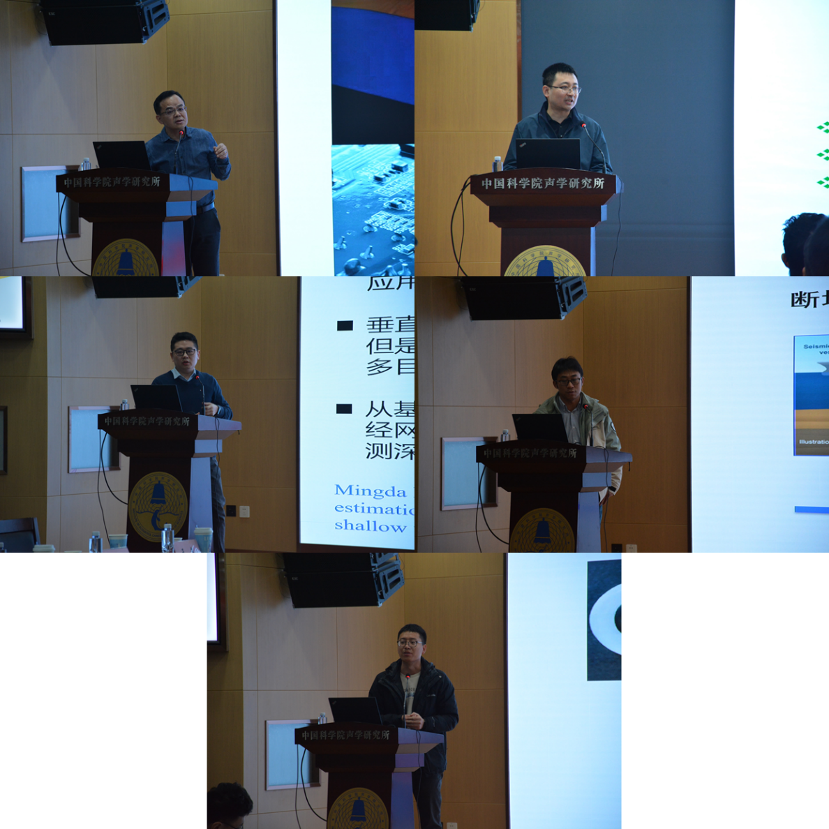 王文研究员、徐及研究员、牛海强研究员、雍鹏博士和郭静文博士分别作题为《基于多物理场耦合的声表面波气敏新机制》、《水声目标智能识别技术》、《基于神经网络特征匹配的垂直阵多声源测深》、《基于全波形反演的高精度地震成像方法研究》和《基于水平集拓扑优化方法的声学超结构高效设计》的学术报告,展示了实验室本年度取得的代表性研究成果。学术秘书胡承昊博士汇报了实验室开放课题的申请与执行情况。