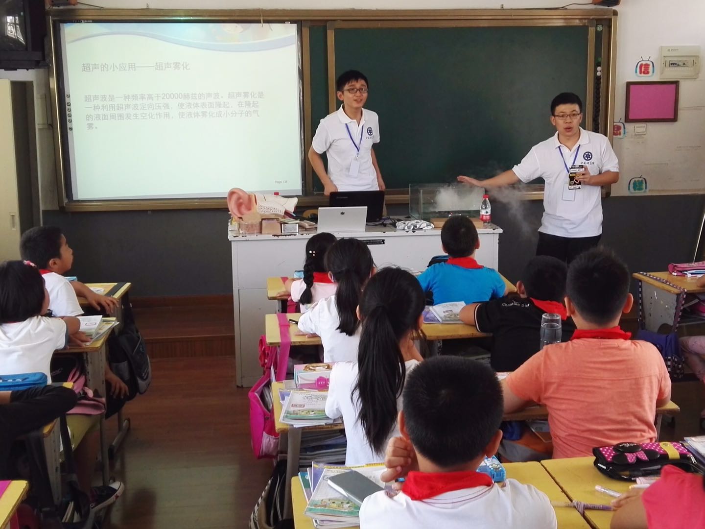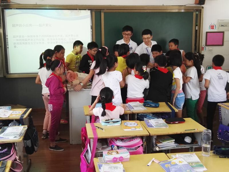 我站利用“快速听力筛查仪”为每个参与的孩子们做了听力检查,受到现场学生和老师们的一致好评。间隙,志愿者们还利用超声雾化装置让学生肉眼看到声音的能量并了解超声在生活中的应用,为再次赴岱山开展科普活动做好了铺垫。