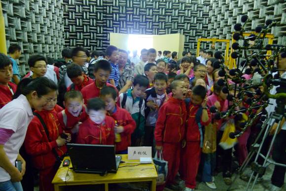 本届中科院开放日活动还吸引了外地中学生到北京来接受科普教育,声场声信息国家重点实验室的任云同志专门为来自浙江乐清中学的高二学生设计制作了一套科研课题《神秘的声世界》,从声学的概念到水声学的应用及水声学的等方面提出问题,让他们带着问题进行参观,参观过程中可以向科研人员提问,完成他们的科研课题,最后学校进行评比。这样的活动不仅是让学生们走一走看一看,更是让他们加深了印象,增加了学习兴趣。这种做法值得推广,我们决定在以后的开放日中学习借鉴。我们还为海淀实验二小的师生和家长制作了一期专题节目,事先由科学家根据小学生的兴趣爱好和特点,制作了专门的答卷,在同学们参观前下发,让同学们带着问题参观体验。孩子一边参观,一边留心着答卷上的题目,不仅亲身体验了声音在产生和传播过程中产生的各种奇妙变化,又学到了知识。