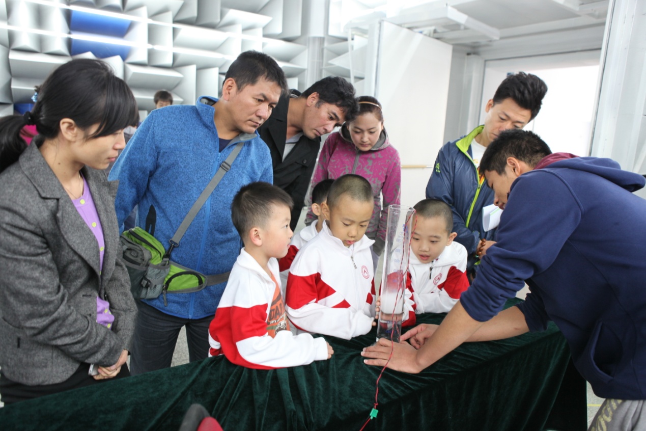 随后,同学们饶有兴趣地观看了声学科普短片。参观了声学所混响室、全消声室、水声测试水池。在半消声室,同学们亲自感受了高指向性扬声器的神奇,大家积极踊跃围上前尝试这种“指向谁,谁才能听见”的新鲜设备。现场展示的超声清洗机、超声雾化仪更是吸引了同学们的眼球,很多小同学将手伸进超声清洗机中亲自尝试,体验了超声清洗的神奇作用。“声相仪”将声音变换成人眼可见的图像的技术,更让同学们直观的看到声音产生的部位。在水池和综合声纳实验室,同学们看到了水下机器人和合成孔径声纳的成像效果,对声音的作用有了更丰富的认识。对于混响室里特殊的声音感受,小同学们十分好奇,撒欢儿的跑着、跳着、喊着,感受着声音的神奇……
