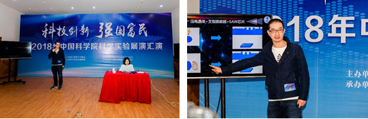 声表面波在地震中是破坏大王,科学家却抓住它来做好事了。超声技术中心的薛蓄峰、尹怡宁合作演示《烫不烫?让地震波中的破坏大王告诉你》,用传感器、读卡器、电脑现场搭建基于声表面波的无线无源测温系统,成功测试出一杯开水、一杯碎冰的温度,普及了声表面波“转害为益”的研究成果之一。