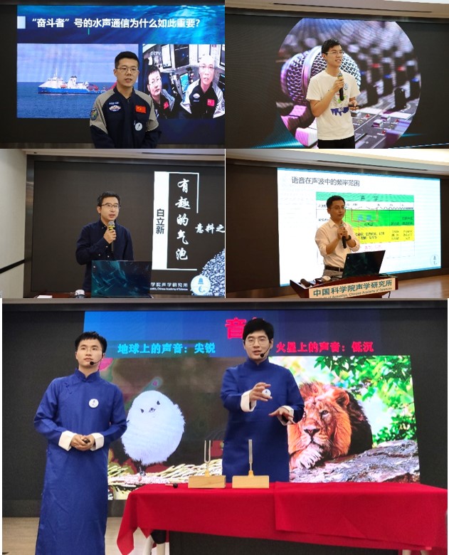 声学所首次采取线下与线上相结合的活动形式,借助微博、抖音、今日头条等新媒体平台,面向公众开放,让更多的人了解声学所,感受声学世界的奥妙和独特魅力。声学所科普社准备了5场科普报告。“奋斗者”号声学团队的廖佳伟作《“奋斗者”号万米发声》报告,讲述了如何让“奋斗者”号耳聪目明万米发声,发出时代最强音的故事。石志奇带来《小孔中的声学大智慧》,介绍了马大猷院士1975年提出的微穿孔板理论,通过科学家小故事,弘扬了老一辈科学家严谨求实的科学精神。白立新的报告《意料之外与情理之中——有趣的气泡》带大家走进微观世界,认识这些在意料之外又在情理之中的有趣气泡,领略它平凡中的神奇;张鹏远揭秘《语音的奥秘》,讲述在人工智能时代,科学家们对声音的研究有哪些最新的进展;汤起斌、孙冠文联袂出演《来自火星的“你好”》,与大家一起认识火星上的声音与在地球上相比究竟有哪些不同,火星上的声波有什么特别的用途,探索火星上的声音奥秘。报告内容同步在声学所的抖音、头条等账号“中科院声学所”、中国科普博览微博、北京青年报新媒体矩阵播出,观看量达98.7万。