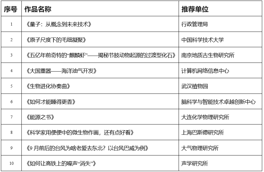为大力普及科学知识、弘扬科学精神、提高全民族科学素养,中科院科学传播局组织开展了2020年优秀科普微视频作品征集评选活动。截至2021年8月,共收集到48部科普微视频。经专家评审,评选出10部作品为中科院优秀科普微视频作品,名单如下:
