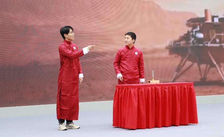 在“嗨剧场”,声学所献上科学相声《来自火星的“掌声”》。声学所两位研究生陈帆杰、张博将诙谐幽默的段子和“祝融号”热点融入声学科普知识,引领观众朋友们感受神奇的声音世界;声学所博士李瑨瑶在吉他弹唱中,科普了乐器中的声学知识,曼妙的歌声引起现场掌声连连。