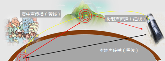 从震中到远方的监测点,次声波有三种传播途径。最先到达的是通过地壳传播到监测点后激发出的同振次声波(图中黑线),其次到达的是地震动引起途中山体晃动产生的次声波(图中红线),最后到达的是从震中位置通过大气传过来的次声波(图中黄线)。