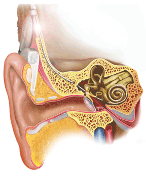 人工耳蜗(cochlear implant)又称电子耳蜗,是一种特殊的声-电转换装置,分为体外机和植入体两部分,体外机的言语处理器一般挂在耳背上,体外机的传输线圈和植入体的接收线圈通过磁铁吸附在一起,植入体部分经手术植入体内,电极穿入耳蜗的鼓阶内,模拟人体耳蜗功能,将环境中的声音信号转换为电信号,并将电信号传入患者耳蜗,刺激耳蜗残存的听神经,从而产生听觉。