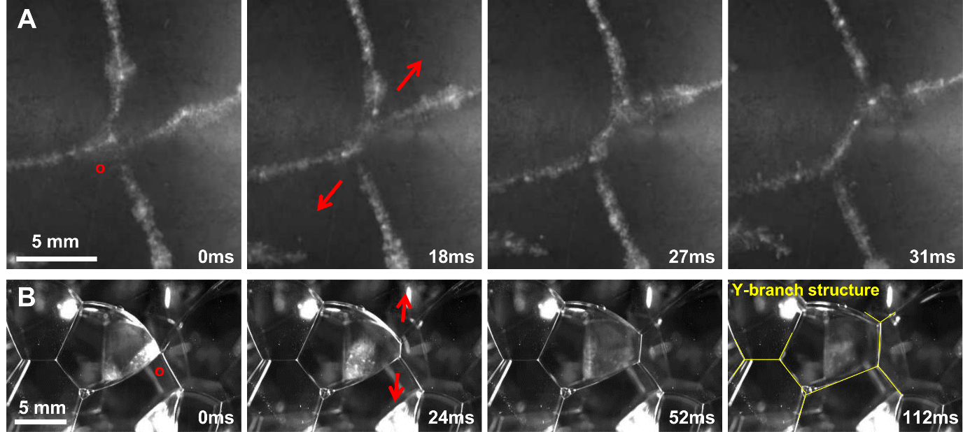 研究表明,空化结构会随着薄液层厚度的变化而改变,而杆状结构是云区和水区边界的稳定特征元素。杆状结构倾向于彼此交联形成稳定的三叉结构,这种三叉结构的角度服从高斯分布(μ = 119.93)。
