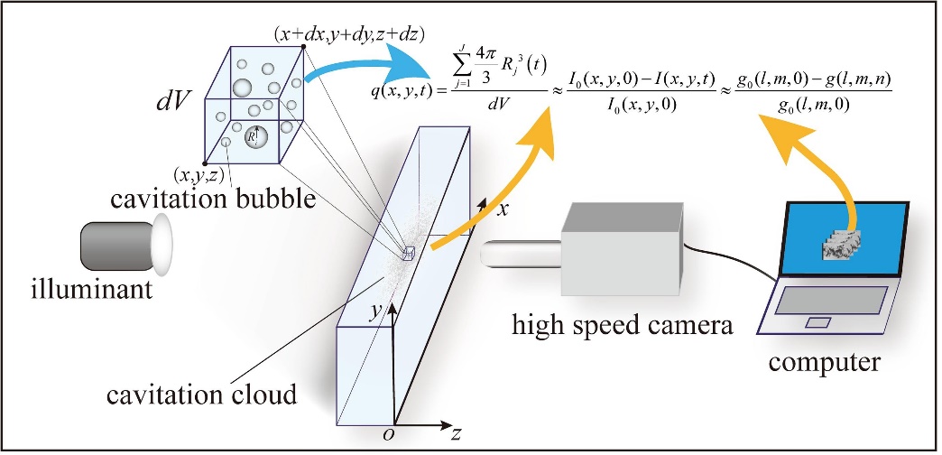 基于高速摄影图像分析来测量空化强度,主要分为两个环节。第一步,建立空化状态变量q与透过空化云的光强分布之间的物理关系(图1黄色箭头);第二步,从观测照片中提取光强分布信息,结合第一步得出空化状态变量,再对空化状态变量进行时间平均,即可得到表征空化强度的量。