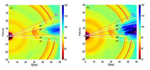 图2. 海底山后方45°-122°方位角范围内的传播损失实验结果与理论计算结果比较(图/中科院声学所)