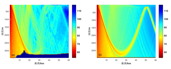 图1. RAM-PE模型计算的声传播损失,左图为实测海底地形下的计算结果,右图为接收阵位置处深度的平坦海底(图/中科院声学所)