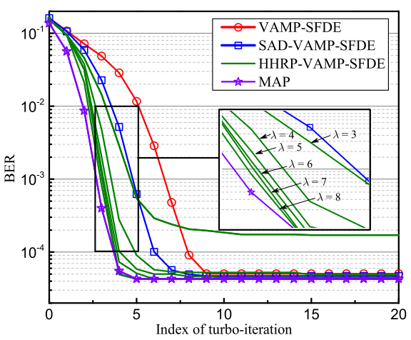 研究结果显示,在具有严重频率选择性的Proakis C信道下,HHRP-VAMP的均衡性能以及收敛性均接近于理论最优的MAP均衡,优于目前已有的各类VAMP均衡算法。