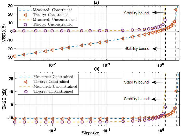 欠定频域自适应滤波算法收敛性能分析:当自适应滤波器阶数小于实际系统的阶数时,无约束的频域算法收敛到无约束的维纳解,而约束的版本则不能,这使得无约束算法比约束算法具有更低的最小MSE(Mean-Square Error)。科研人员也证实均值最优并不一定带来MSE最优,这纠正了先前一些研究成果中的错误结论,并强调了MSD(Mean-Square Deviation)和MSE两个技术指标不一定正相关。该研究成果先后2019年6月和10月在线发表于 IEEE Transactions on Circuits and Systems I: Regular Papers 和 Signal Processing 。