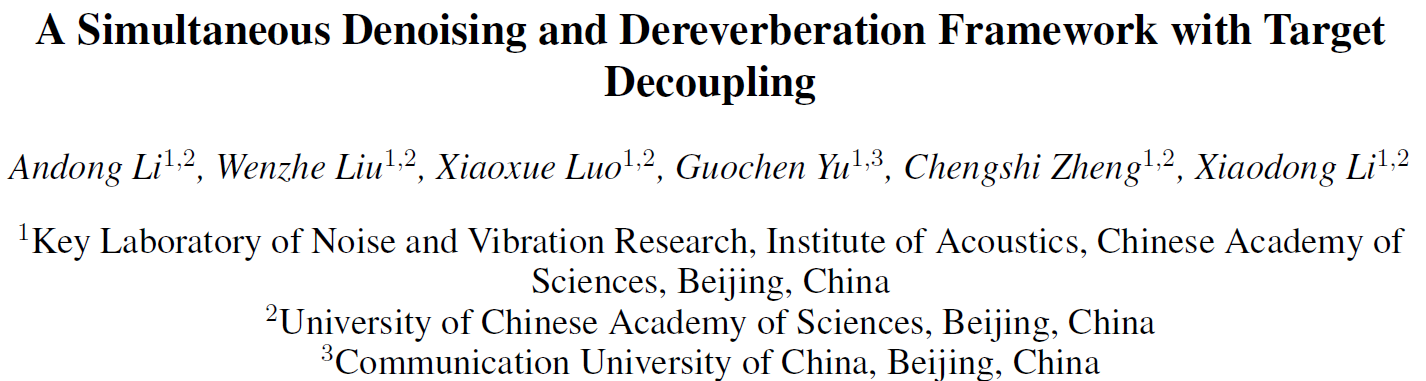 同时,基于该方案撰写的论文 A Simultaneous Denoising and Dereverberation Framework with Target Decoupling 已被Interspeech 2021接收,并在会议上进行了分享交流。