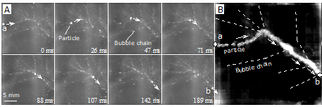 空化现象是一种非常独特的物理现象,它以单个振动空泡为基本单元,以空泡集群(空化云)的形式出现并排布成具有一定自组织特性的相对稳定的空间结构。中科院声学所超声学实验室计算声学与声能应用课题组硕士生马雨航等人提出了一种基于超声空化云的物质输运新机制,可以实现固体颗粒的非接触、可控、无管道、定向输运。这项研究在肿瘤介入治疗中提高靶向药物的寻靶能力,以及类水系枝状结构的微反应器的设计等方面具有潜在应用价值。