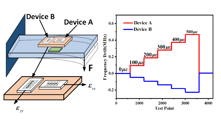 中科院声学所超声学实验室王文课题组在前期工作基础上,提出并实现了一种采用正交差分结构的声表面波应变传感器件新型设计方法,即将具有一定频差的两个声表面波芯片正交设置于相同基座并封装,利用其相反力敏极性及相似温敏特性提升应变灵敏度,同时实现良好的温度自补偿。同时结合有限元与微扰理论建立了该传感结构的力敏机理分析模型,以实现其优化设计。