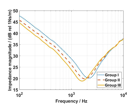 图 3 乳突力阻抗和年龄之间的关系(Group I表示22-29岁的受试者;Group II表示32-50岁的受试者;Group III表示52-67岁的受试者)。(图/中科院声学所)